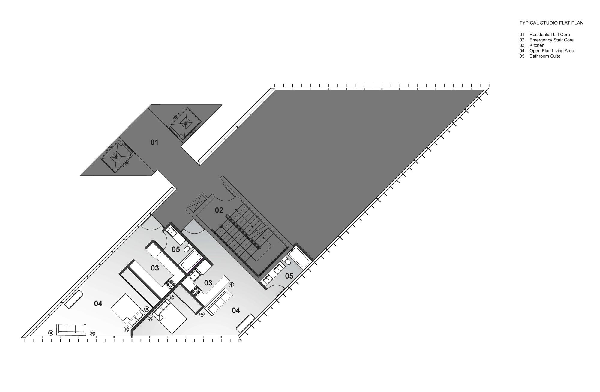 The dynamic prism shape of the buildings maximizes the amount of natural light and openness of each unit type, between studios and three bedrooms. The angling and setback of the buildings allow for view corridors and slipping planes that maximise the views of City Hall to the north and NY Harbor to the east and south, which has enabled us to maximise daylight and the views.