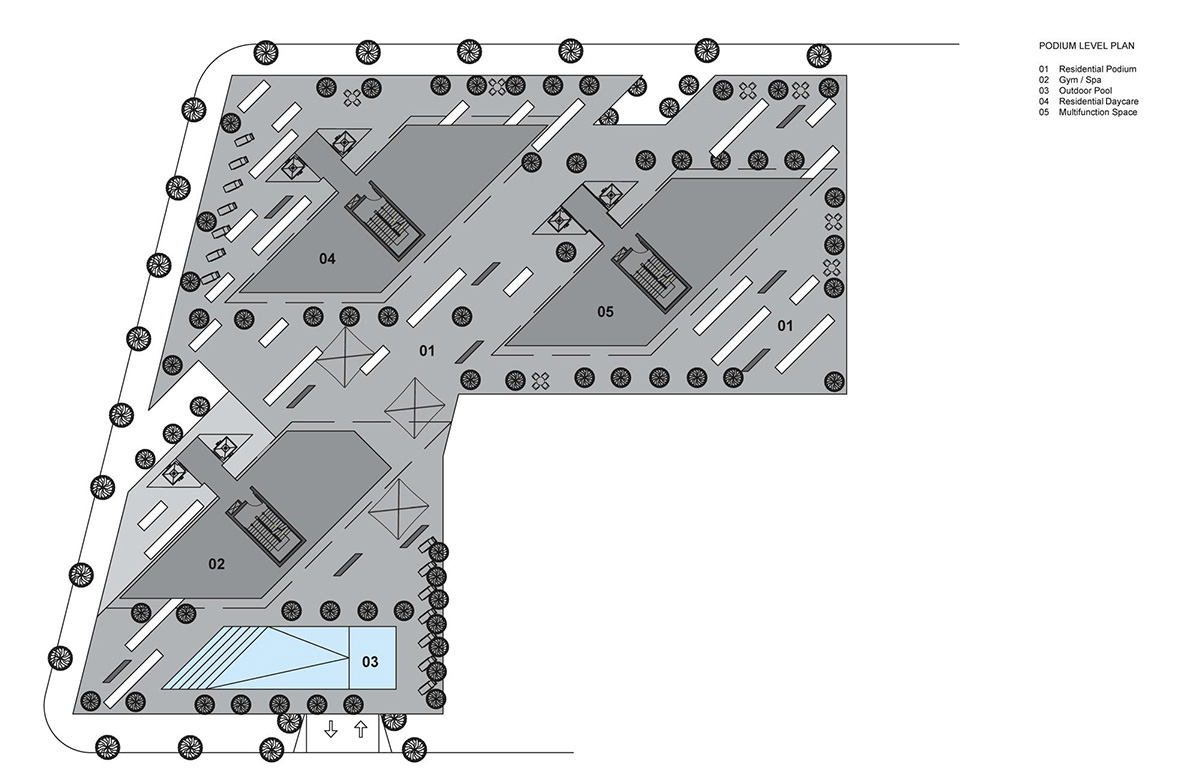 Our approach was to go away from the MEGA BLOCK and to create a truly dynamic urban landscape and all levels associated with the building. Made up of three pavilions, we wanted to create a family of buildings, where the towers are of different heights bound by a very strong three-dimensional geometry. The heights would allow for a dynamic building line and would ensure that each tower enjoyed uninterrupted views. The geometry of the building would allow every apartment the luxury of three sided floor to ceiling glazing… thus creating a truly panoramic city view to die for.