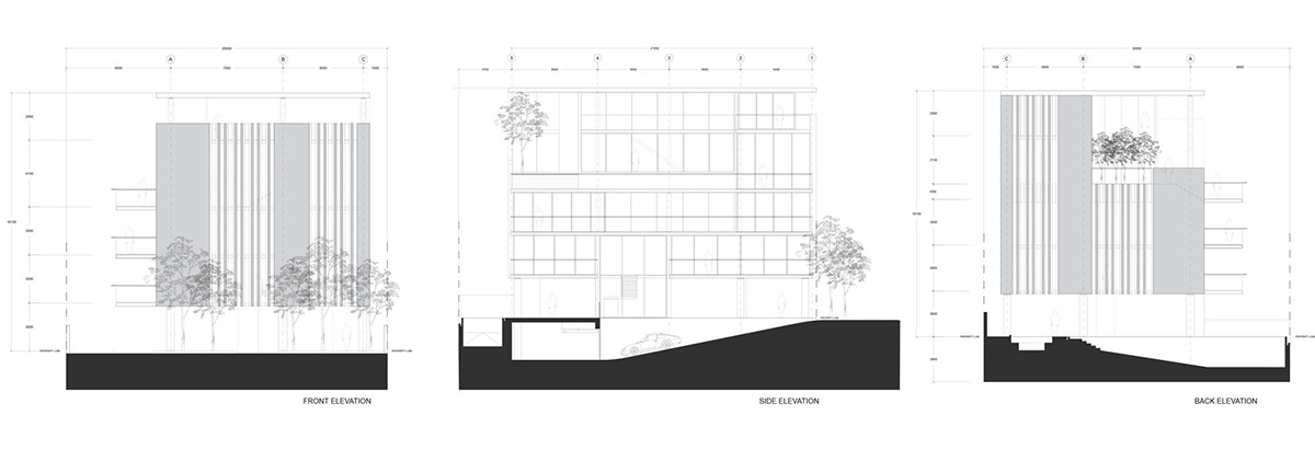 On a sloping site overlooking the Atlantic Ocean, Carbon was approached to design Executive Flats for corporate rentals with a luxury penthouse for the owner/developer and his family, in Dakar Senegal . Designed as a series of floating pavillions, the facade wraps to create varying solar fins that reflect the need for privacy facing the street.